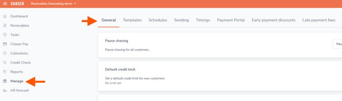 1. Navigate to Manage --> General dashboard in Chaser