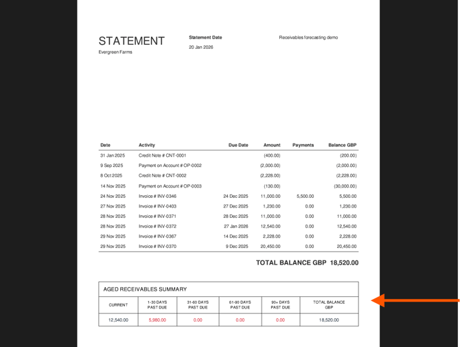 Configure statement settings to include ageing buckets at the bottom of your customer monthly statements