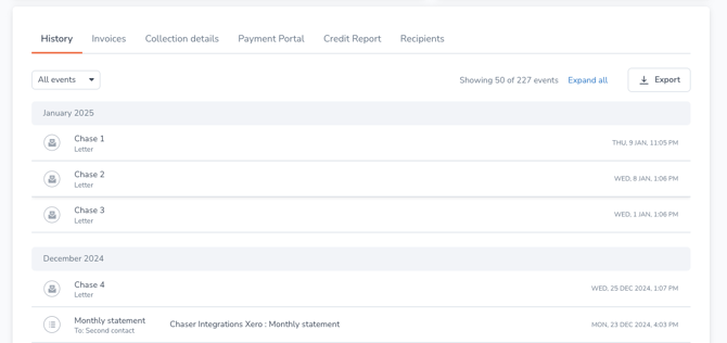 Customer history can be exported using the Export button. Filter on a specific event (such as Chasing or Notes) to export certain event types.