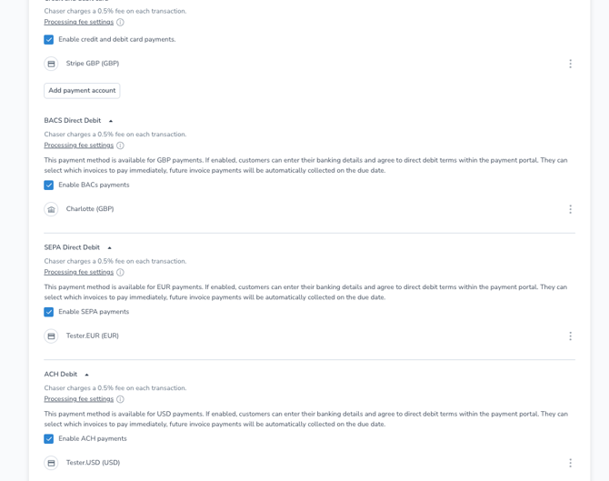 - If you use Xero or QuickBooks Online, select your payment account for each payment method so that Chaser knows where to register the payments in your accounting system (this step is not required for other integrations)