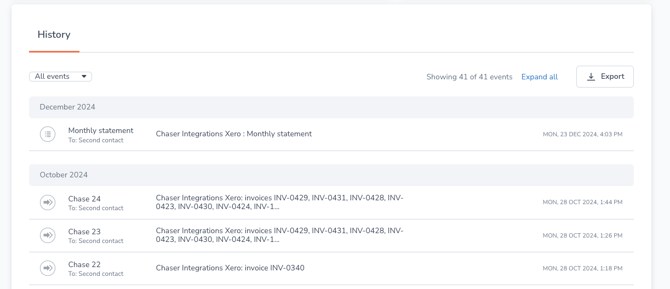 Invoice history can be exported using the Export button. Filter on a specific event (such as Chasing or Notes) to export certain event types.