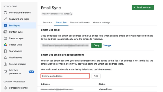 This email address will need to be validated. Read Pipedrive's help article on Smart Bcc for more information.