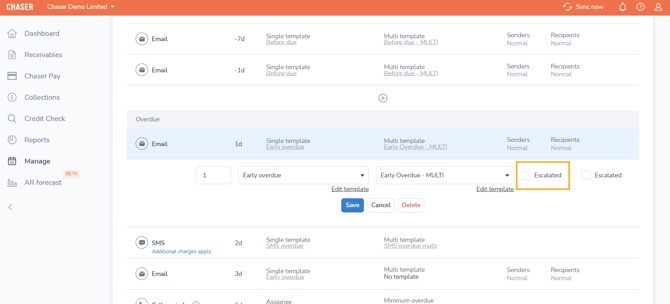 To edit which senders are used within a specific schedule, navigate to Manage > Schedules > click into the relevant schedule. You can edit within each individual chase whether a Normal or Escalated sender is used by clicking into the relevant row. You will see a tick box to specify an Escalated sender, if this is left un-ticked then a Normal sender will be used.
