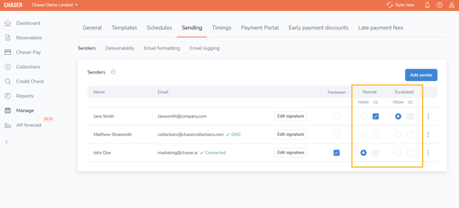 By using the Normal and Escalated column you can decide which senders are relevant based on the severity of the overdue invoice. You can also select someone to be copied into emails by selecting the CC tick box.