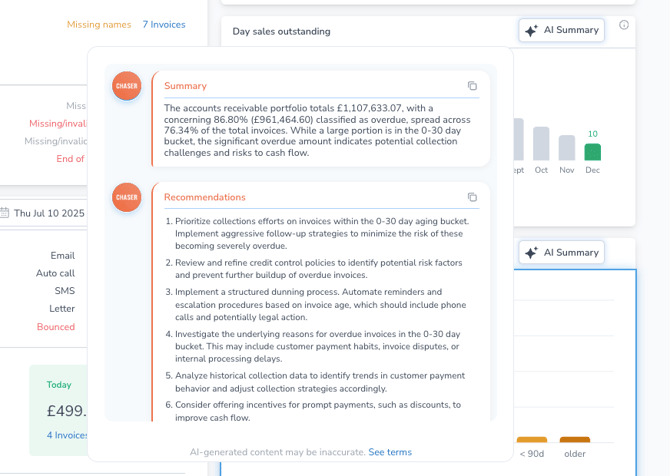 Click the AI summary button on either the day sales outstanding (DSO) or outstanding amount dashboards to generate a smart summary with key insights and personalized recommendations to help improve your receivables performance.