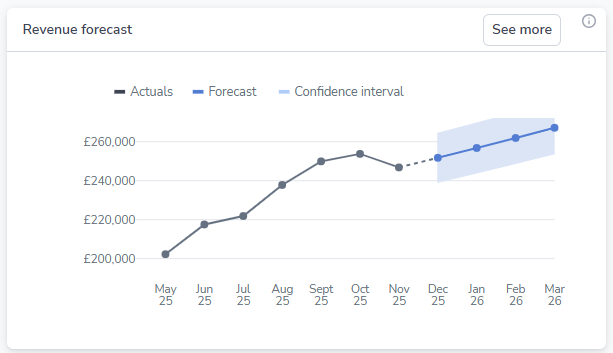 You can access the full Revenue Forecast page by clicking the See more button. This page provides a key summary and a detailed breakdown of projected revenue performance, including: