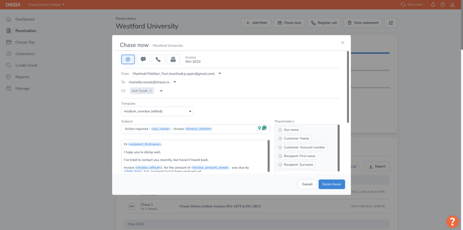 Select Chase now in any of the above ways, and a popup will open. Select which template you want to send from the dropdown and edit it if needed.