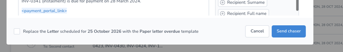 Select the tickbox to send your ‘Chase now’ in place of your next scheduled chase when chasing a single invoice. Uncheck this option at the bottom of the Chase Now module if you want the next scheduled chase to go out. This is not available when using ‘Chase now’ for multiple invoices: