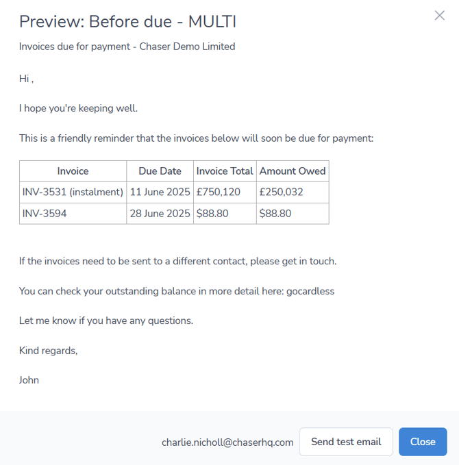 This will allow you to view your template and formatting as your debtors would. Click the Preview button, and then choose Send test email in the bottom right corner to send a chase to the signed-in user.