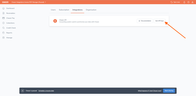 4. In the Chaser API module, select Get API keys. If you don't see this option please reach out to support@chaserhq.com to activate the Chaser API on your Chaser account :