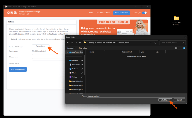 Select Option 1 in the dropdown on the invoice PDF manager desktop application. Click Select folder and select the folder where your invoice pdfs will be stored. Ensure you have inserted both your Chaser key and Chaser secret.