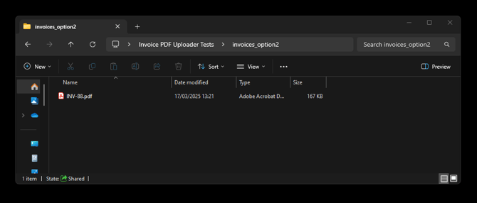 Below is a preview of the contents of the invoice_option2 folder; there is a single invoice PDF titled INV-88.pdf. With Option 2 selected, the invoice PDF manager desktop application will extract the name INV-88, find the most recently uploaded invoice in the Chaser browser application with the Invoice Number INV-88 and then attach INV-88.pdf to the invoice in Chaser. This will ensure the invoice pdf is attached to any email chases and is available to download in the Chaser payment portal.