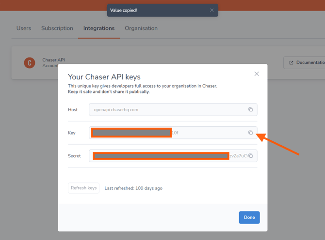 3.1 In the Chaser browser application, copy your Chaser Key by selecting the copy icon: