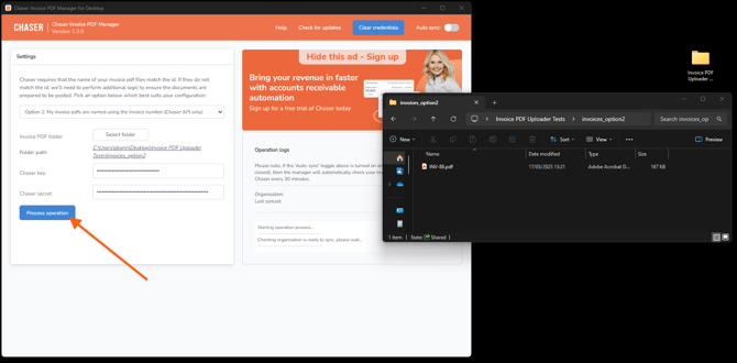 Selecting Process operation in the invoice PDF manager, will begin processing and then uploading the invoice pdfs to Chaser: