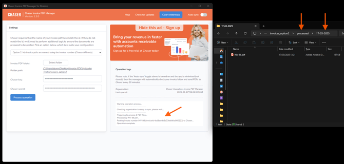 To confirm that the invoice PDF manager has been configured correctly for Option 1, please ensure that your Chaser API keys are properly set up and that a corresponding invoice exists in the Chaser browser application. If you attempt to post an invoice to Chaser using the invoice ID and no matching invoice is found, the invoice will remain in the folder. The desktop application will continue to attempt processing it until the relevant invoice becomes available in Chaser.