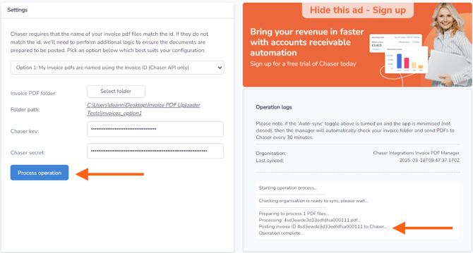- The Operation logs section at the bottom of the invoice PDF manager displays real-time information about the sync process