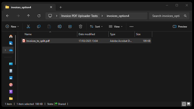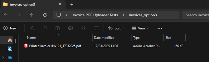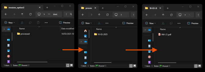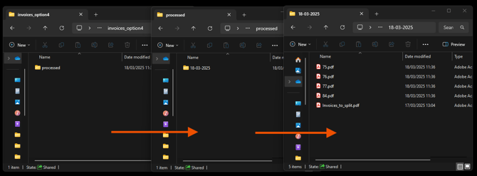 In the desktop folder invoices_option4 you can see that a folder named processed has been created and that the file Invoices_to_split.pdf has been moved to a date stamped folder 18-03-2025 inside the processed folder. The individually extracted invoice pdfs also can be found in the 18-03-2025 folder.