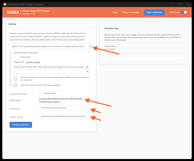 Select Option 4 in the dropdown on the invoice PDF manager desktop application. Click Select folder and select the folder where your invoice pdfs will be stored. Ensure you have inserted both your Chaser key and Chaser secret if you intend uploading the split pdfs to Chaser.