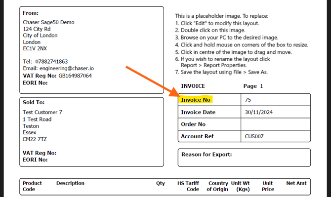 In the invoice PDF example below, the invoice number '75' which matches the value of the invoice number inside the Chaser browser application contains the header Invoice No , it is this header which appears on every page which can be used to identify where the invoice number sits. This is needed to instruct the invoice PDF manager to find this header and extract the following field (invoice number) on every page and then separate the pages according to the Invoice No.