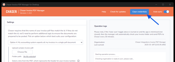 The Auto sync option is enabled by default when ever you open the application. If you don't wish the to use the invoice PDF manager alongside Chaser, then you may wish to turn this option off. Simply select the blue toggle, a grey toggle means that Auto sync is switched off.